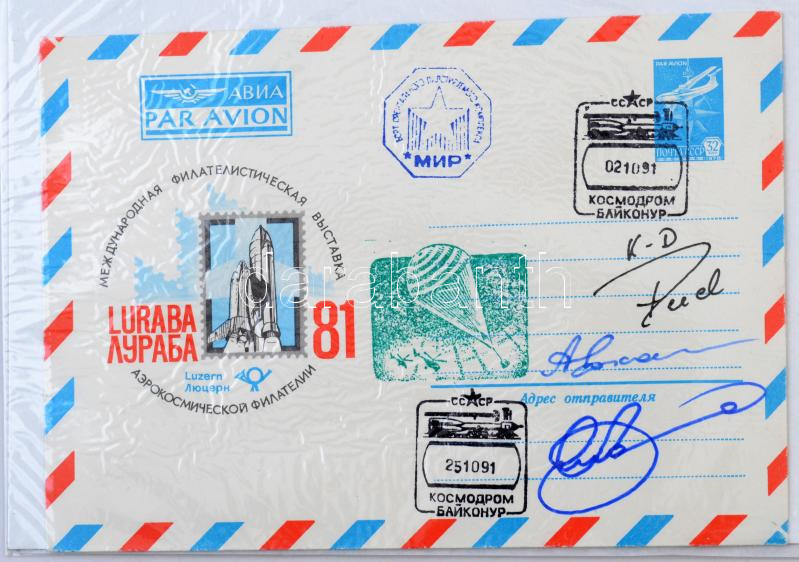 Description: Alekszandr Viktorenko (1947- ), Alekszandr Kaleri (1956- ) orosz és Klaus-Dietrich Flade (1952- ) német űrhajósok aláírásai emlékborítékon /