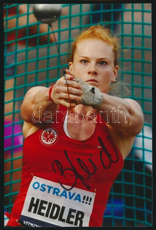 Betty Heidler (1983-) olimpiai bronzérmes és világbajnok kalapácsvető aláírása egy őt ábrázoló fotón, 15x10 cm./ autograph signature
