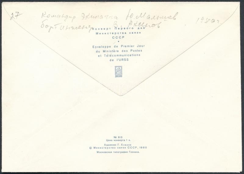 Description: Jurij Malisev (1941-1999) és Vlagyimir Akszjonov (1935- ) orosz űrhajósok aláírásai emlékborítékon /