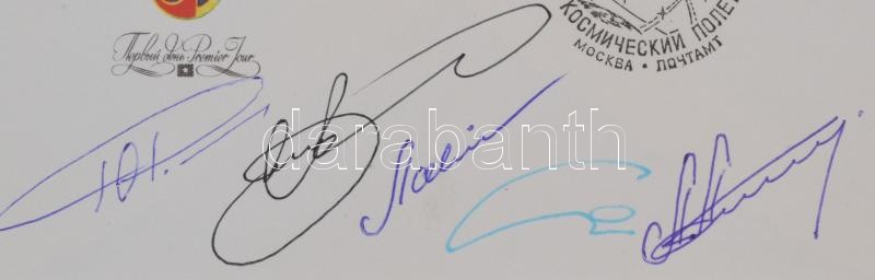 Jurij Viktorovics Romanyenko (1944- ), Alekszandr Lavejkin (1951- ), Alekszandr Viktorenko (1947- ) szovjet, Alekszandr Alekszandrov (1951- ) bolgár és Muhammad Faris (1951- ) szír űrhajósok aláírásai emlékborítékon /