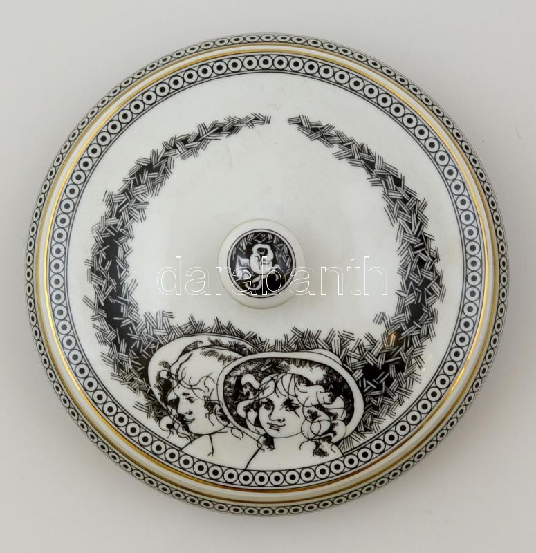 Hollóházi Jurcsák László által tervezett porcelán bonbonier, matricás, apró kopásnyommal, jelzett, d:16 cm