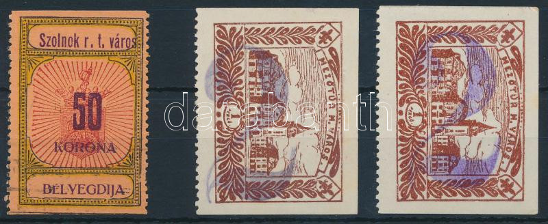 1922-1923 Szolnok városi illetékbélyeg + 1945 2 db 3 oldalon vágott Mezőtúri városi illetékbélyeg (16.500)