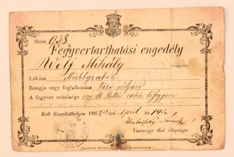 https://www.darabanth.com/en/287-Online-auction/287.0/Other-collectibles/Documents~100016/1862-Fegyvertartasi-engedely-Malomgodri-Muhlgrabeni-eloljaro-reszere-1862-Gun-licence-f~II1443644