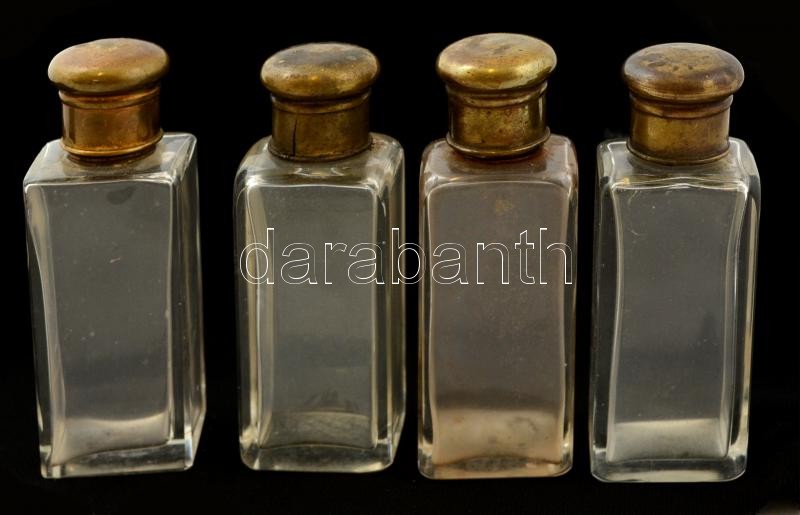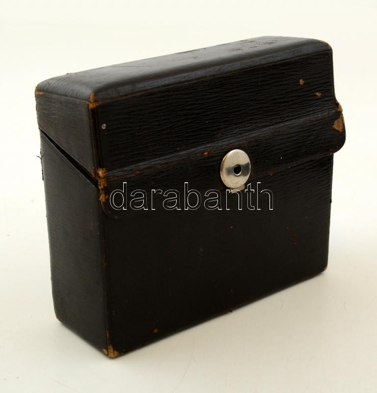 Description: Antik bőr fiola tartó táska, 4 db réz kupakos dupla falú hibátlan fiolákkal ( 4db), egyik dugó szorul, réz kupakon kis repedés és apró horpadás, kapocs sérült, m:11 cm (4×), bőr tok 12×14 cm