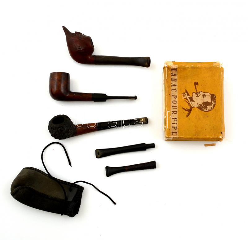 Kis dohány tétel: 3 db pipa, 2 db szipkadohány-tartó, 1 db régi doboz