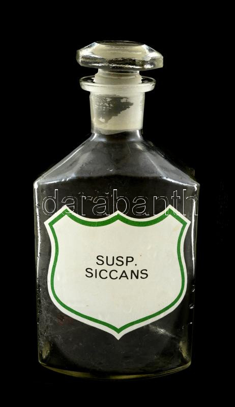 Régi gyógyszeres üveg "Susp. Siccans" felirattal, a dugón kis csorbával, jelzés nélkül, m: 21 cm