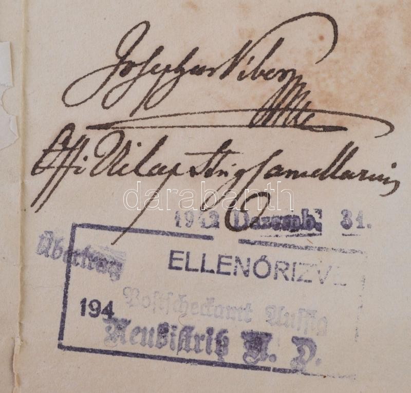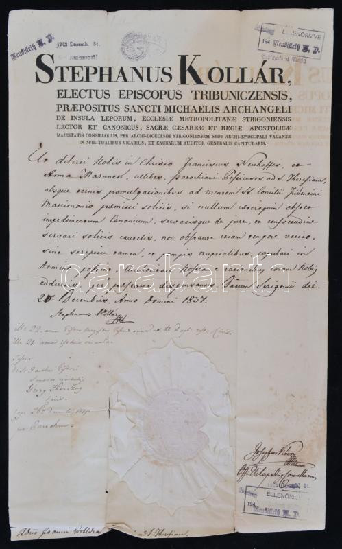1837 Kollár István (1764-1844) királyi tanácsos, választott püspök aláírása egyházi ügyben íródott okmányon, szárazpecséttel, későbbi rábélyegzésekkel, kisebb szakadásokkal.