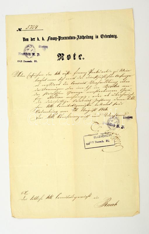1856 Soproni pénzügyi-ügyészség feljegyzése, német nyelven, későbbi rábélyegzésekkel.