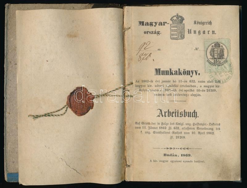 https://www.darabanth.com/en/287-Online-auction/287.0/Other-collectibles/Judaica~100023/1870-Badogos-foglalkozasu-izrealita-szemely-munkakonyv-pecsettel-viaszpecsettel-15-kr-es~II1509171