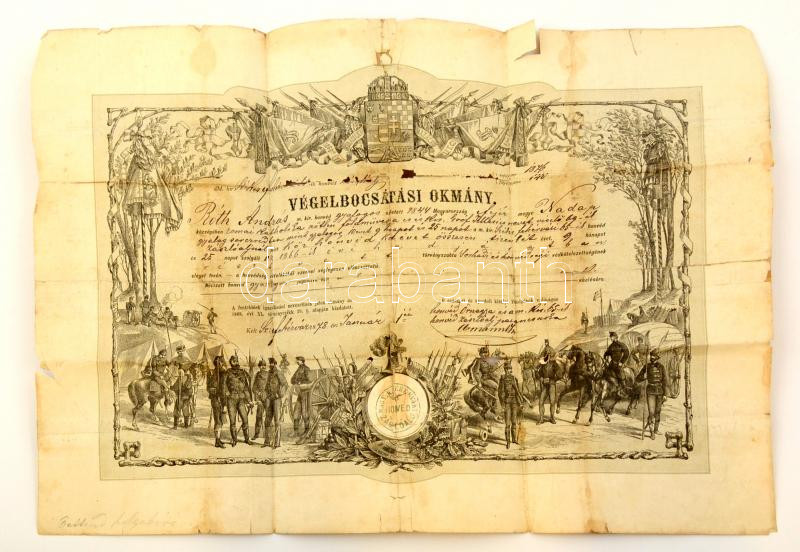 1876 Katonai végelbocsájtó levél megviselt állapotban.