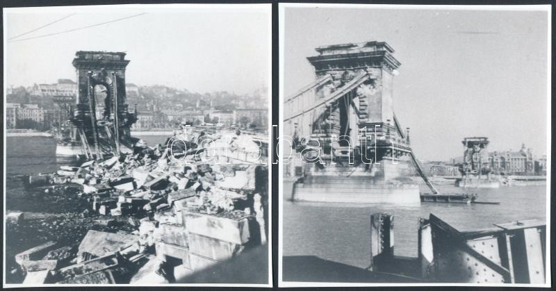 1945 Budapest, A felrobbantott Lánchíd, modern előhívás, 3 db, 12x12 c...