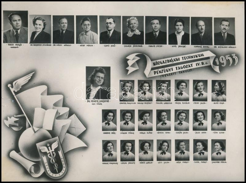 1953 Székesfehérvár, a Közgazdasági Technikum tanárai és végzett növendékei, kistabló 50 nevesített portréval, 17x22 cm