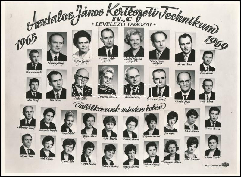 1969 Budapest, Asztalos János Kertészeti Technikum tanárai és a levelező tagozaton végzett hallgatók tablója, 36 nevesített portréval, 21x28 cm