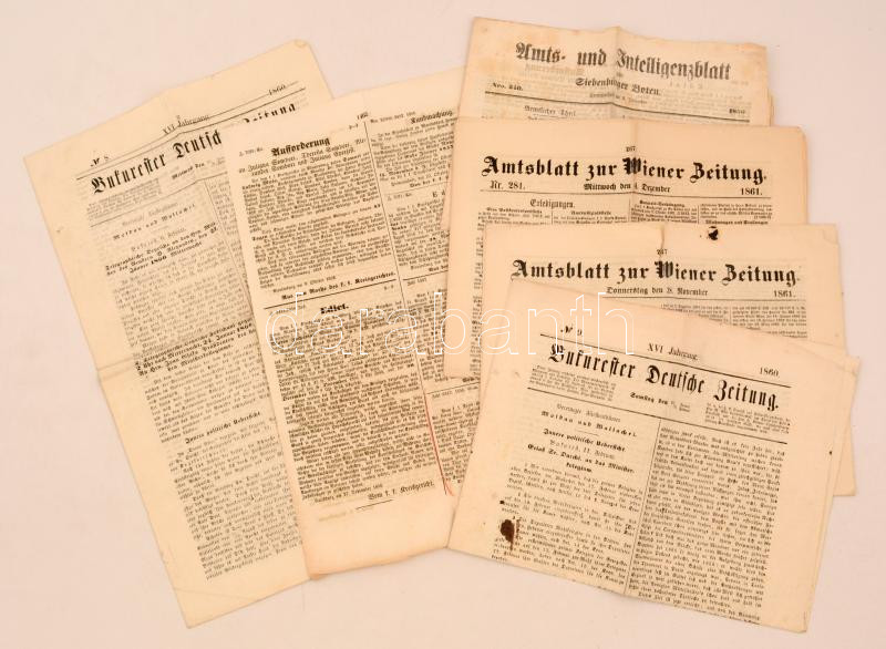 Description: 1856-1861 Vegyes újság tétel: Amtsblatt zur Wiener Zeitung(Nr.276, 281), Amts- und Intelligenzblatt zum Siebenbüprger Boten(Nr.240), Bukurester Deutsche Zeitung(Nr.8, 9)