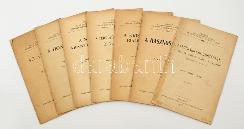 1910-1911 "Uránia" füzetek, 7 db, változó állapotban. Dr, Simonyi Jenő: Az Al-duna. Bp., 1910, Horványánszky Viktor. Kiadói tűzött papírkötés. Dr. Csuday Jenő, Dr. Létmányi Nándor: A Honfoglalás. Bp., 1910, Horványánszky Viktor. Kiadói tűzött papírkötés. Popper Ignác: A magyar aranybányászat. Bp., 1910, Horványánszky Viktor. Kiadói tűzött papírkötés. Horusitzky Henrik: A termőföld képződése és viselkedése. Bp., 1910, Horványánszky Viktor. Kiadói tűzött papírkötés. Dr. Mauritz Béla: A kristályok Birodalma. Bp., 1910, Horványánszky Viktor. Kiadói tűzött papírkötés. Dr. Mauritz Béla: A hasznos ércek. Bp., 1911, Horványánszky Viktor. Kiadói tűzött papírkötés. Dr. Gombos F. Albin: A legujabb kor története. A francia forradalomtól napjainkig. Bp., 1911, Horványánszky Viktor. Kiadói tűzött papírkötés.