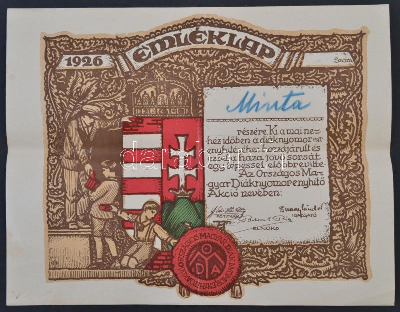 1926 Országos Magyar Diák Nyomorenyhítő Akció Emléklapja, minta, nyomtatott aláírásokkal.