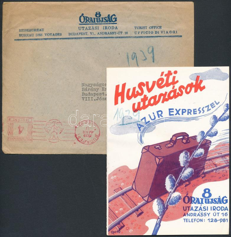 1939 A 8 Órai Újság Utazási Iroda húsvéti utazásokat hirdető prospektusa borítékkal