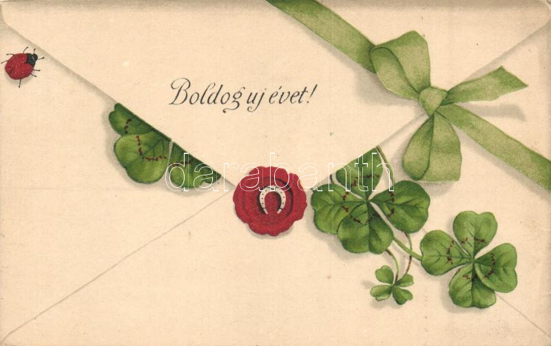 'Boldog Új Évet!' / New Year greeting card, letter, horseshoe, clovers, litho (EK)