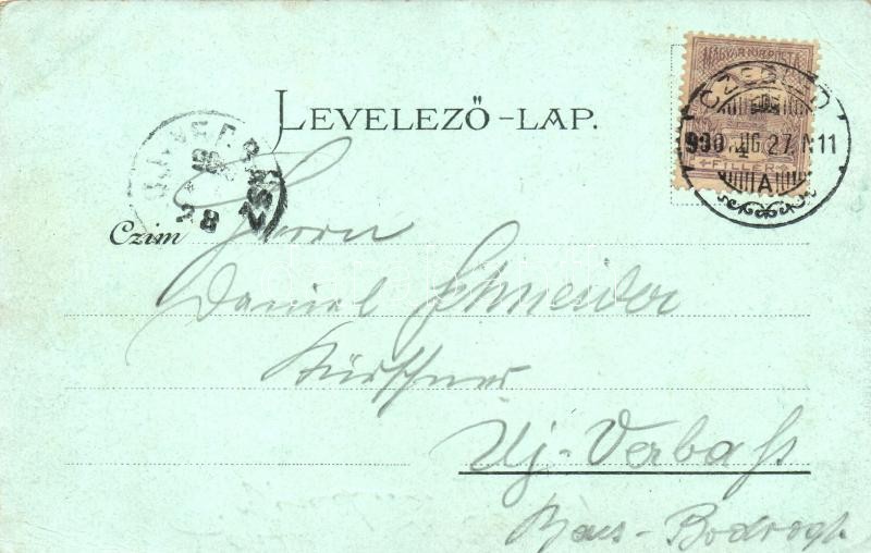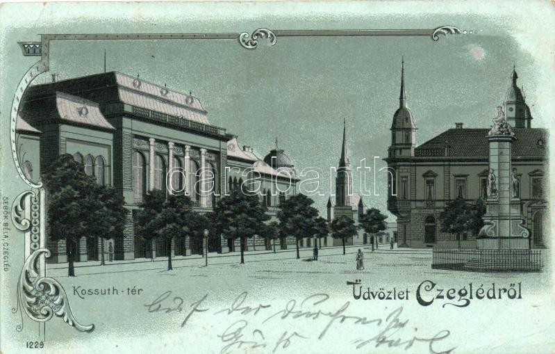 Cegléd, Kossuth tér éjjel; ezüstös díszítésű litho lap, kiadja Sebők B...