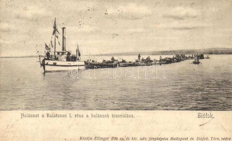 Siófok, Halászat a Balatonon I. rész, a halászok kivonulása, kiadja Ellinger Ede fényképész
