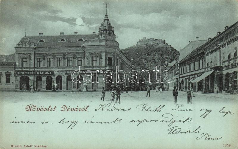 Déva, Holtzer Károly, Szőcs F. Lajos és Hirsch testvérek üzlete. Hirsch Adolf kiadása / square with shops (kis szakadás / small tear)