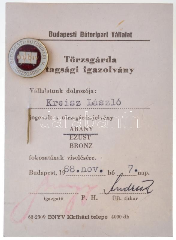 1968. "Budapesti Bútoripari Vállalat Törzsgárda arany fokozata" zománc... https://www.darabanth.com/en/288-Online-auction/288.0/Numismatics/Faleristics-medals-orders-badges~300017/1968-Budapesti-Butoripari-Vallalat-Torzsgarda-arany-fokozata-zomancozott-fem-kituzo-igazo~II1517830