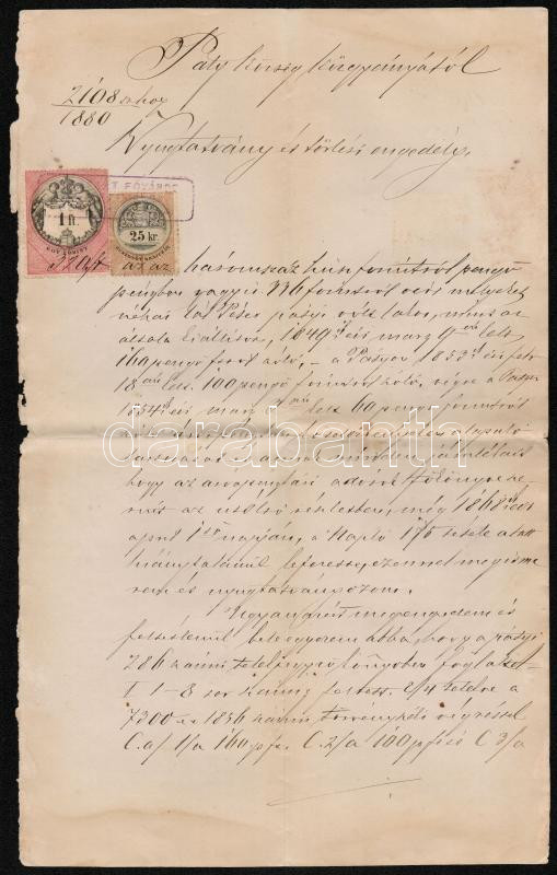 https://www.darabanth.com/en/288-Online-auction/288.0/Other-collectibles/Documents~16/1880-Okmany-25kr-plus-1Ft-okmanybelyegekkel--PATY~II1512995