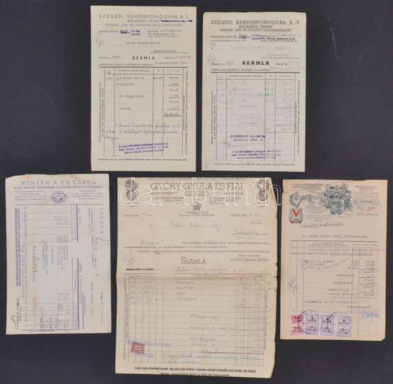 1937-1947 Szeged, 5 db számla, számlailleték bélyegekkel, köztük dísze...