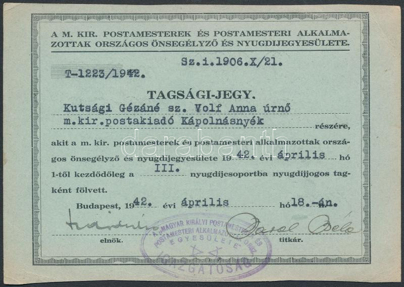 1942 M. kir. postamesterek és postamesteri alkalmazottak országos önsegélyező és nyugdíjegyesületének tagsági jegye, 10x15 cm