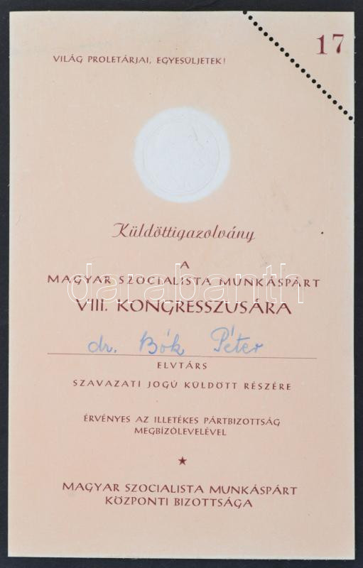 https://www.darabanth.com/en/288-Online-auction/288.0/Other-collectibles/Documents~16/1962-Kuldottigazolvany-az-MSZMP-VIII-kongresszusara-szavazati-jogu-kuldott-reszere-13x8-~II1516271