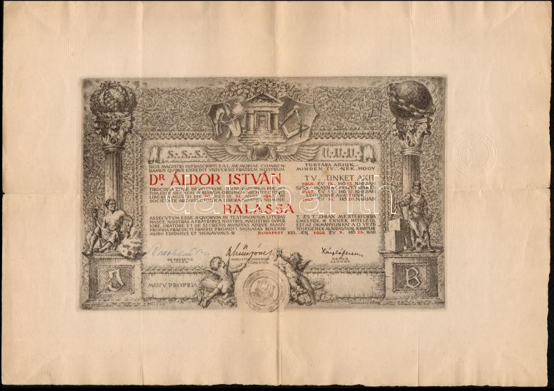 1947-1949 Szabadkőműves iratok, 3 db, közte egy mesterré avatási oklev...