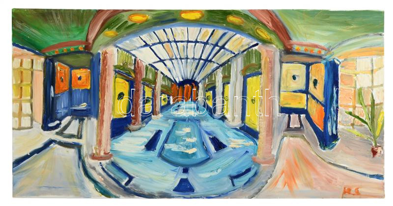 Koltai Emese (?-): Szt. Lukács gyógyfürdő belső tere. Olaj, vászon, jelzett, 40×80 cm