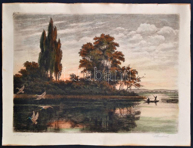 Paulovits Pál (1892-1975): Alkonyat. Színezett rézkarc, papír, jelzett, 25×37 cm