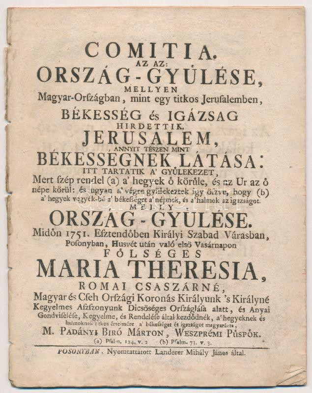 1751 Pozsony, Országgyűlési értesítő