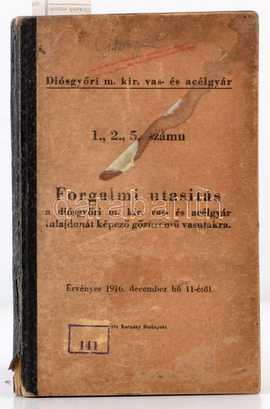 1916 Diósgyőri m. kir. vas- és acélgyár 1. 2 5. számu Forgalmi utasítás. Bp., Szénásy. Kiadói félvászon-kötés, kopottas, foltos borítóval, kissé sérült gerinccel, kissé sérült kötéssel, foltos lapokkal, ceruzás jegyzetekkel.