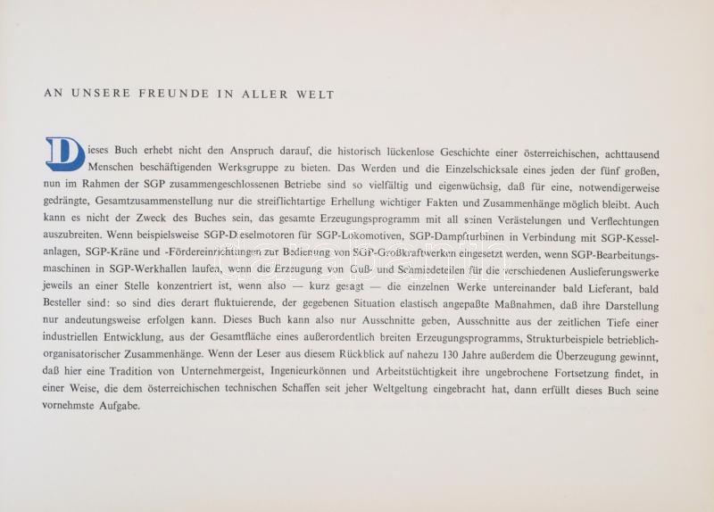 SGP Simmering-Graz-Pauker AG für Maschinen-, Kessel- und Waggonbau. Wien, 1961-1962 SGP (Brüder Rosenbaum-ny.). Kiadói műbőr kötés, számos illusztrációval. Az osztrák vasúti szerelvényeket, mozdonyokat gyártó vállatról történetéről szóló könyv, számos képpel illusztrálva, német nyelven, német, angol, francia, spanyol előszóval. / History of the austrian company of SGP. Leatherette-binding, in German language.