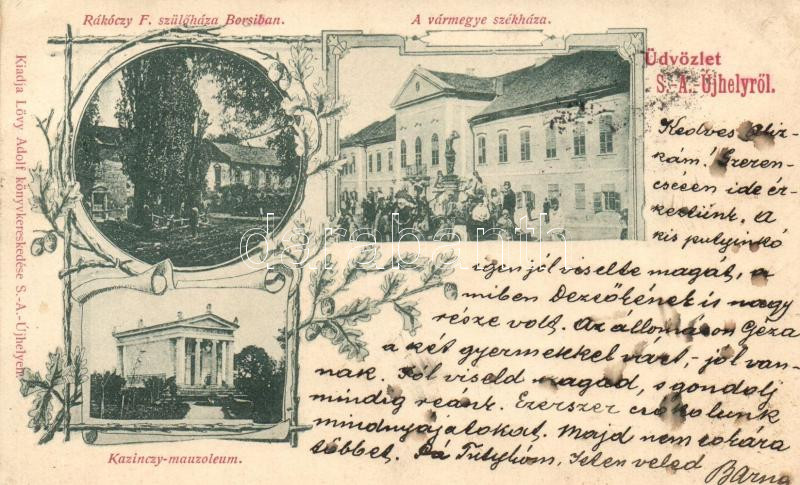 1899 Sátoraljaújhely, Vármegyeház, Kazinczy Mauzóleum, Rákóczi szülőháza Borsiban, floral; kiadja Lőwy Adolf