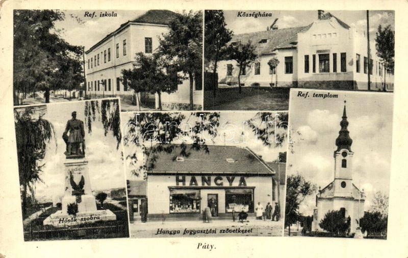 Páty, Református iskola és templom, Községháza, Hősök szobra, Hangya fogyasztási szövetkezet üzlete és kiadása (EK)