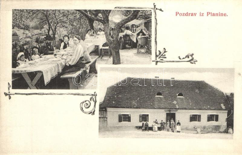 Planina, Restaurant garden with baby carriage, eating families, Art Nouveau