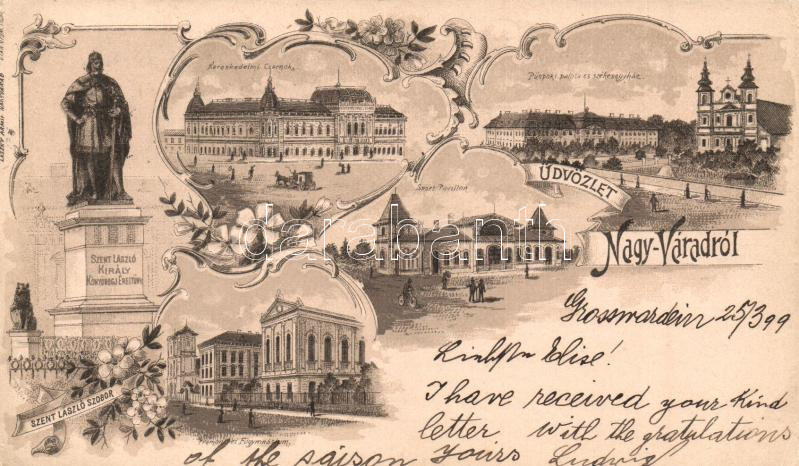 1899 Nagyvárad, Oradea; Szent László szobor, Püspöki palota és székesegyház, Kereskedelmi csarnok, Sport pavilon, Főgimnázium / statue, bishop's palace, commercial hall, sport pavilion, grammar school, floral, Art Nouveau litho (fa)