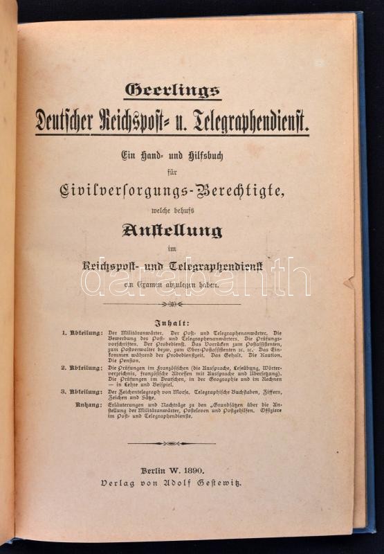 Description: Geerlings Deutscher Reichspost- und Telegraphendienst. Ein Hand- und Hilfsbuch für Civilversorgungs-Berechtigte, welche behufs Anstellung im Reichspost- und Telegraphendienst ein Examen abzulegen haben. Berlin, 1890, Adolf Gestewitz. Kiadói egészvászon-kötés, kissé kopottas borítóval, az előzéklapok foltosak, német nyelven./