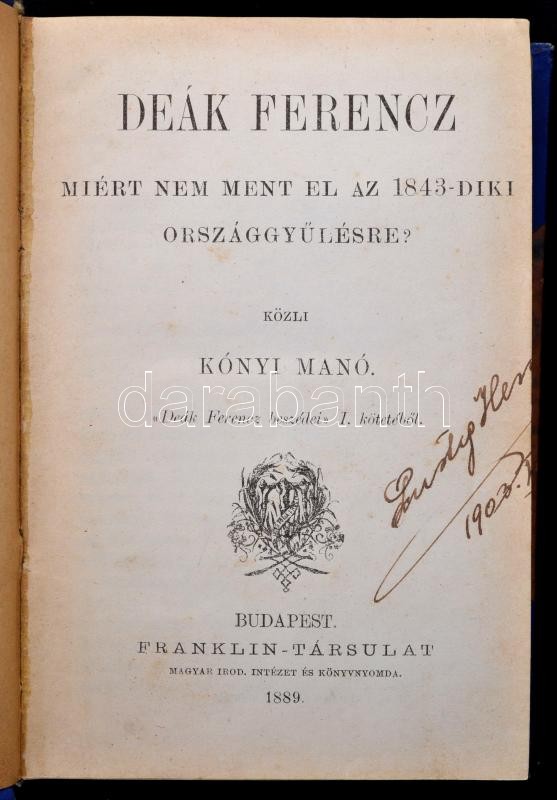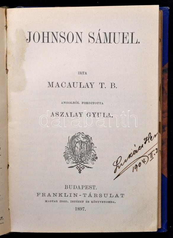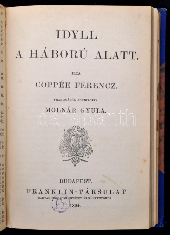 Az Olcsó Könyvtár 4 kiadványa egybekötve: Kónyi Manó: Deák Ferenc. Miért nem ment el az 1843-diki országgyülésre? Bp., 1889, 105+6 p. Coppée Ferenc: Idyll a háború alatt. Fordította Molnár Gyula. Bp., 1894, 108+4 p. Átkötött félvászon kötés, kissé kopottas borítóval. Macaulay T. B.: Johnson Sámuel. Fordította Aszalay Gyula. Bp., 1897, 59+4 p. Spielhagen Frigyes: Az utolsó órában. Fordította Halasi Aladár. Bp., 1881, 162 p.
