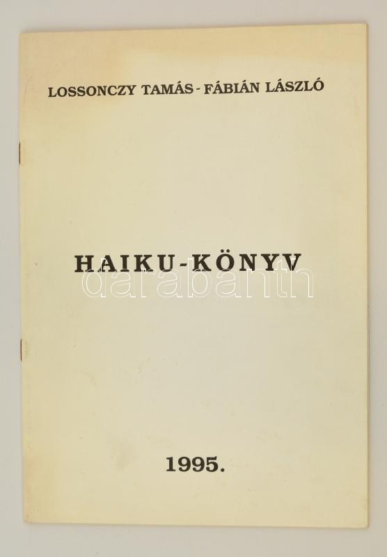 Lossonczy Tamás - Fábián László: Haiku-könyv. Bp., 1995, Artenta Művészeti Bt. A szerzÅ‘k aláÃrásaival, 23. számú sorszámozott példány, készült 250 példányban. Tűzött papÃrkötésben, jó állapotban.