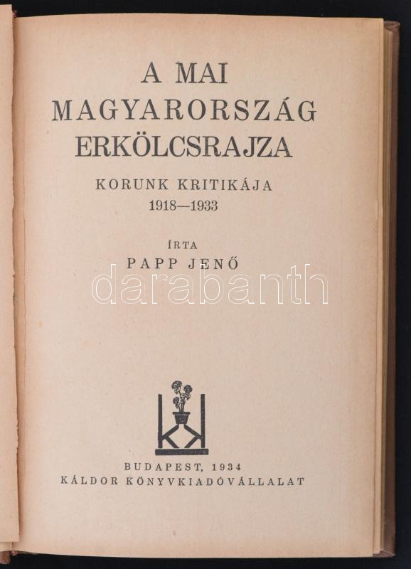 Papp Jenő: A mai Magyarország erkölcsrajza. Korunk kritikája 1918-1933... https://www.darabanth.com/en/289-Online-auction/289.0/Books/Books-Social-sciences~52/Papp-Jeno-A-mai-Magyarorszag-erkolcsrajza-Korunk-kritikaja-1918-1933-Bp-1934-Kaldor-Kony~II1520398