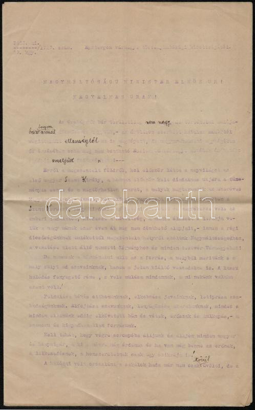 1919 Palkovics László (1877-1933) Esztergom vármegyei alispánnak a vármegyei törvényhatósági bizottság nevében Friedrich István miniszterelnöknek címzett legitimista hangvételű levele, amelyben határozott cselekvésre szólítja fel a döntéshozókat, gépelt fogalmazvány, javításokkal