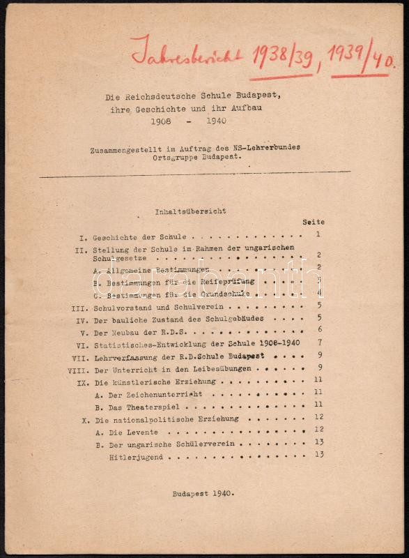 1940 Bp., Die Reichdeutsche Schule Budapest, ihre Geschichte und ihr Aufbau 1908-1940, 14p