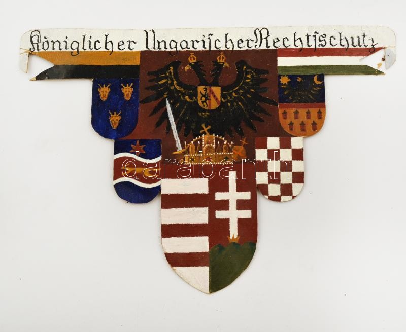 Description: cca 1900 "Königlicher Ungarischer Rechtsschutz" feliratú kézzel festett magyar középcímer, vegyes technika, karton, jelzés nélkül, kis sérüléssel, 23×33 cm