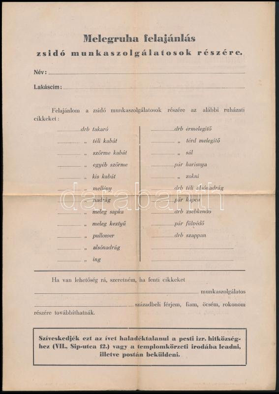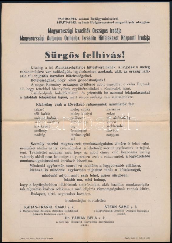 https://www.darabanth.com/en/289-Online-auction/289.0/Other-collectibles/Judaica~24/1942-Magyarorszagi-Izraelitak-Orsz-Irodajanak-felhivasa-zsido-munkaszolgalatosok-reszere-~II1524641