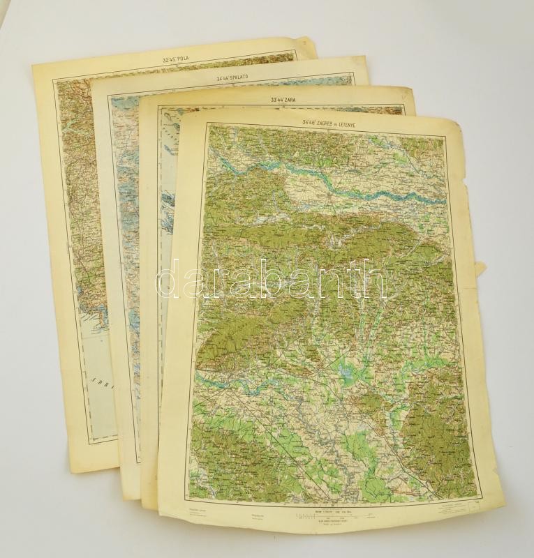 Description: cca 1910 Katonai térképek gyűjteménye. Horvát, területek, egy térkép szakadt. / Collection of military maps. Croatian, areas 4 pieces: Zagreb, Zara, Spatato, Pola 65x48 cm
