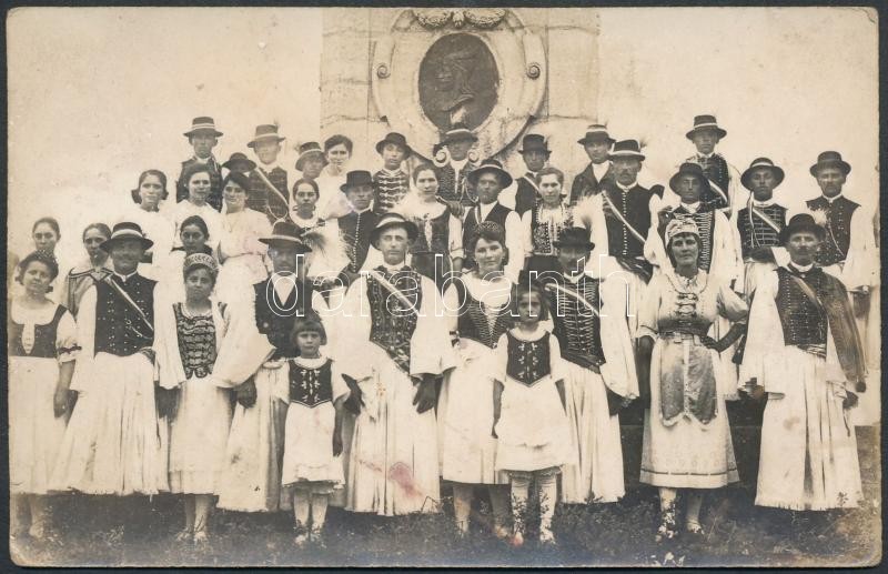 cca 1920-1940 Népviseletes csoport fotója egy emlékmű előtt, 9x14 cm.